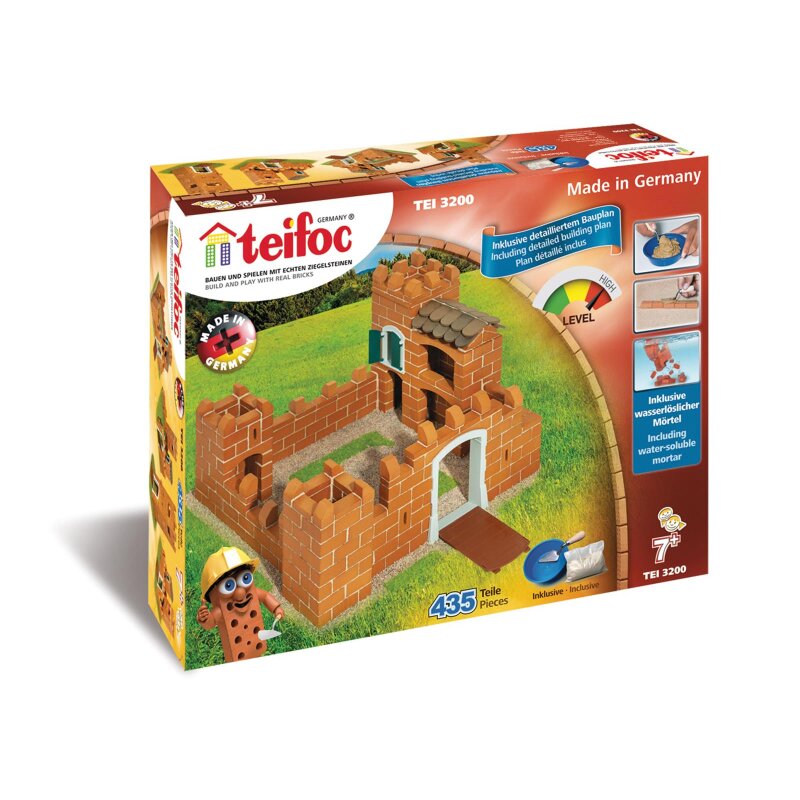 Uzmite ciglu i nanesite na nju dovoljnu količinu maltera. Stavite ciglu na podnožje i snažno pritisnite. Gletaricom uklonite višak maltera koji se pojavi pri guranju. Opeke postavite pravilno horizontalno i vertikalno kako bi zidovi ostali ravni. Drveni i plastični delovi takođe se mogu učvrstiti malterom. Ako želite srušiti strukturu, ostavite je u vodi 4 do 5 sati, a zatim operite cigle i osušite ih. Prilozeni malter dovoljan je za višestruki sastav strukture, ali kada ga iskoristite, jednostavno kupite kutiju maltera. Možete graditi prema našim planovima ili upotriebiti maštu. Kombinjući ovaj set s drugim teifocovim građevinskim kompletima od opeke, vaše dete može stvoriti vlastiti, samoizgrađeni svet zgrada!